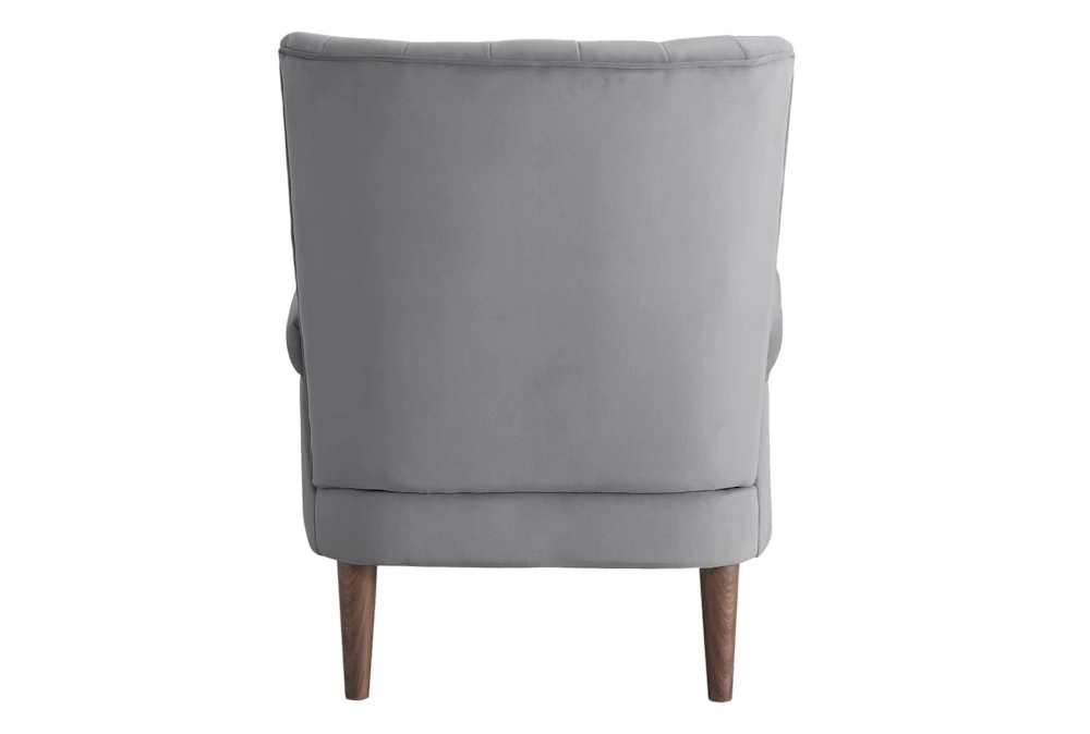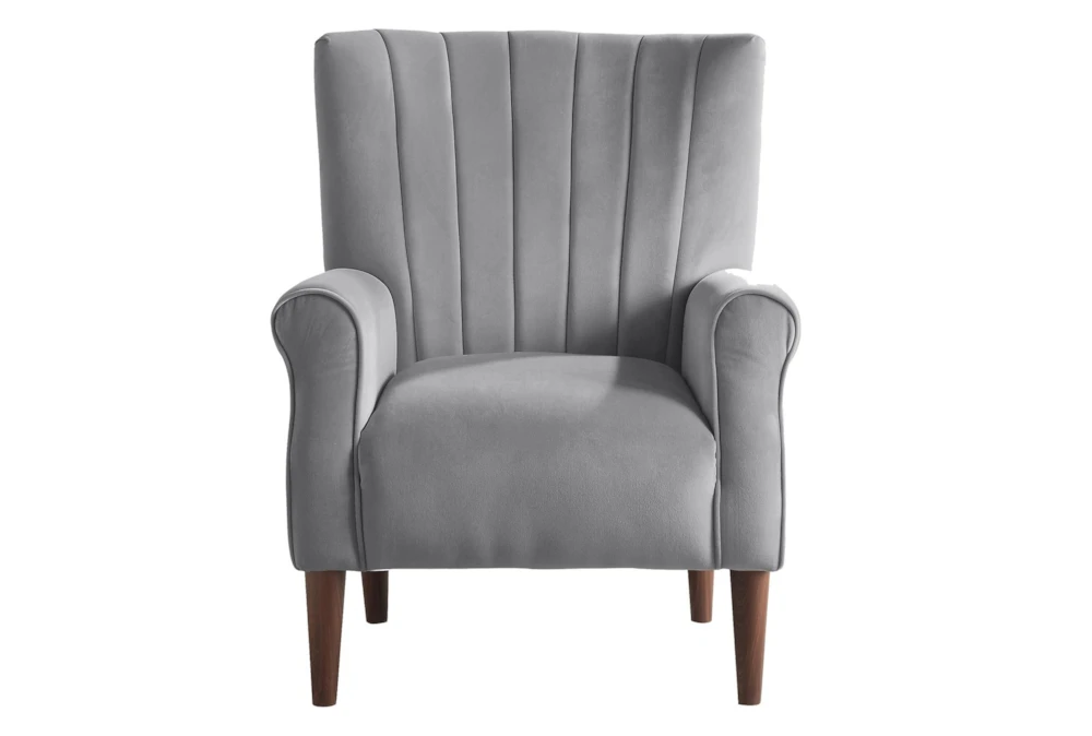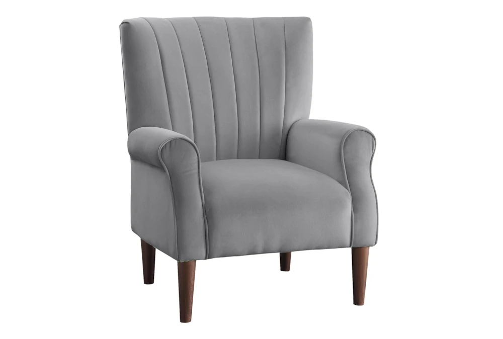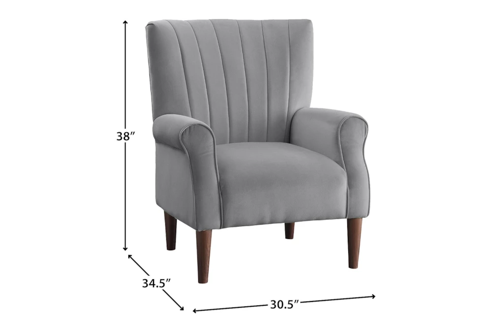 The Abram Grey Accent Chair is a traditional indoor club chair made of velvet and wood, with rolled arms, foam cushions, and a tight, channel-tufted back. This dark gray chair requires assembly and has a secondary material of engineered wood and fabric.