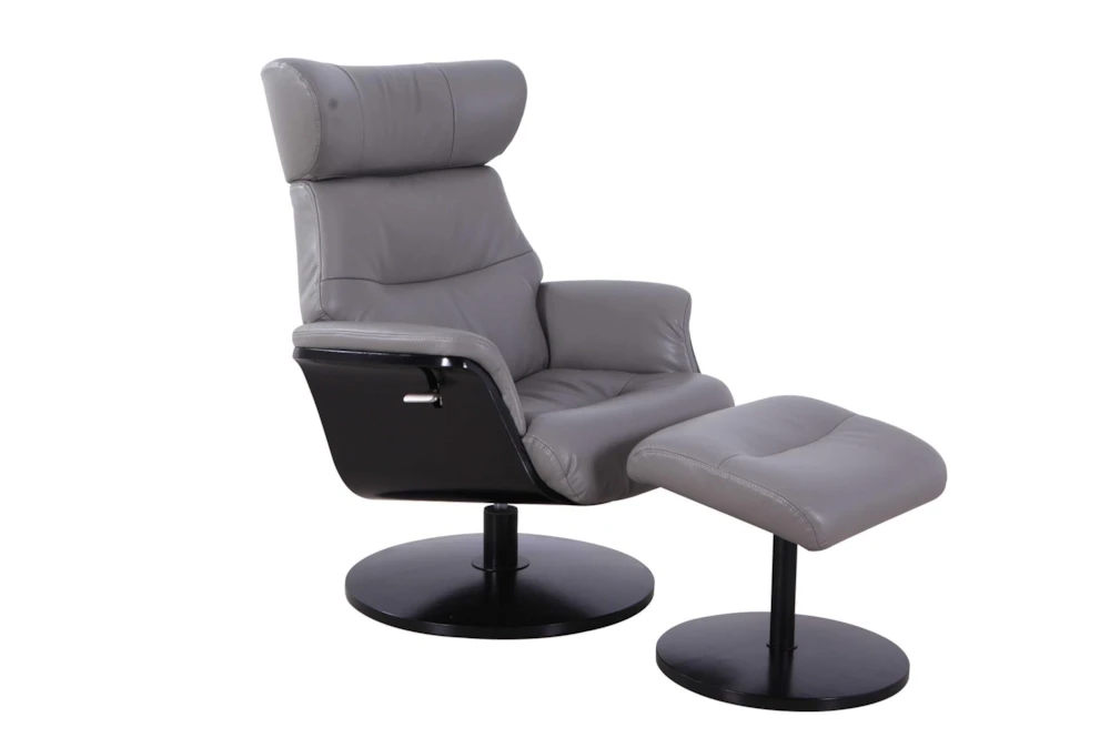 This Algot Grey Faux Leather Reclining Swivel chair and Ottoman is a modern addition to any living space, featuring a weather-resistant polyurethane material and 360-degree swivel capabilities. Assembly is required, and the chair also includes a cable release recline mechanism and memory foam seating for maximum comfort.