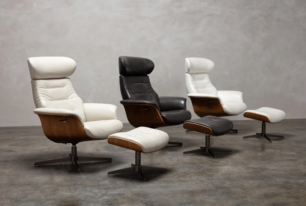 Inspired by an iconic design, our Amala ottoman delivers all the comfort, quality and sophistication of its predecessor, but at an extraordinary value. Rest your legs and experience the luxury of 100% top grain leather and the motion of a metal swivel base, which has a memory return feature that spins back to your original position. Seriously, you will love lounging here, and look cool while you do it.