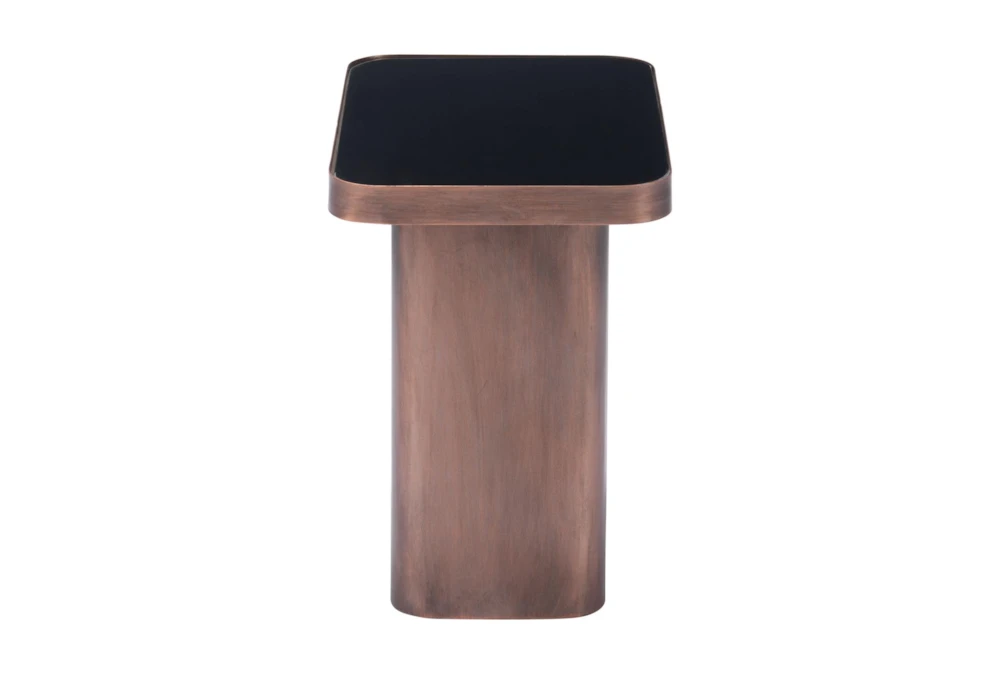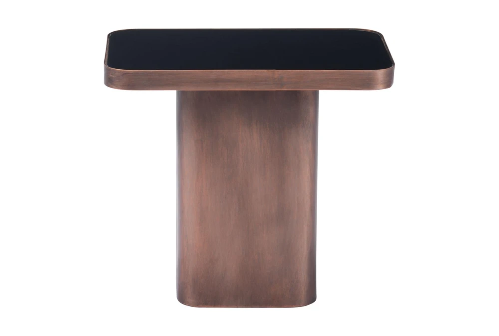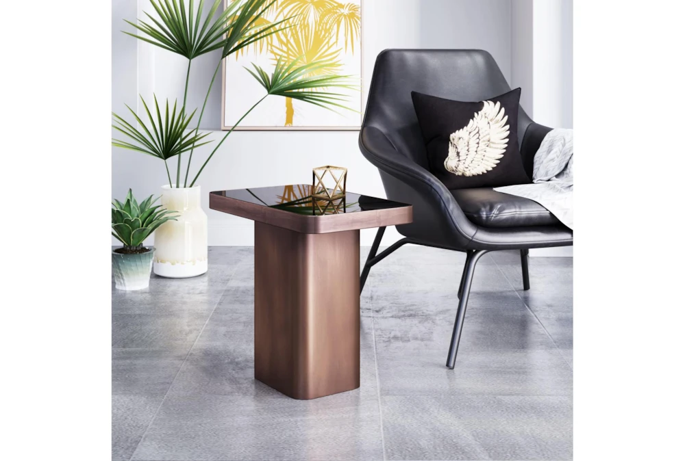 This Brown Pedestal End Table with Painted Glass Top is a stunning addition to any modern space. Crafted from durable metal, its sleek design is perfectly complemented by the unique painted glass top.