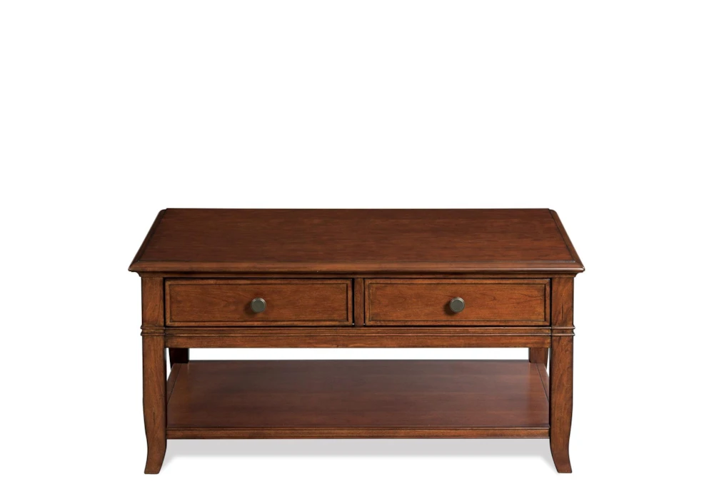 The Cadwell Coffee Table With Storage is a casual piece of furniture made of burnished cherry and poplar wood that comes in a beautiful brown color. It features drawers for added storage and requires some assembly.