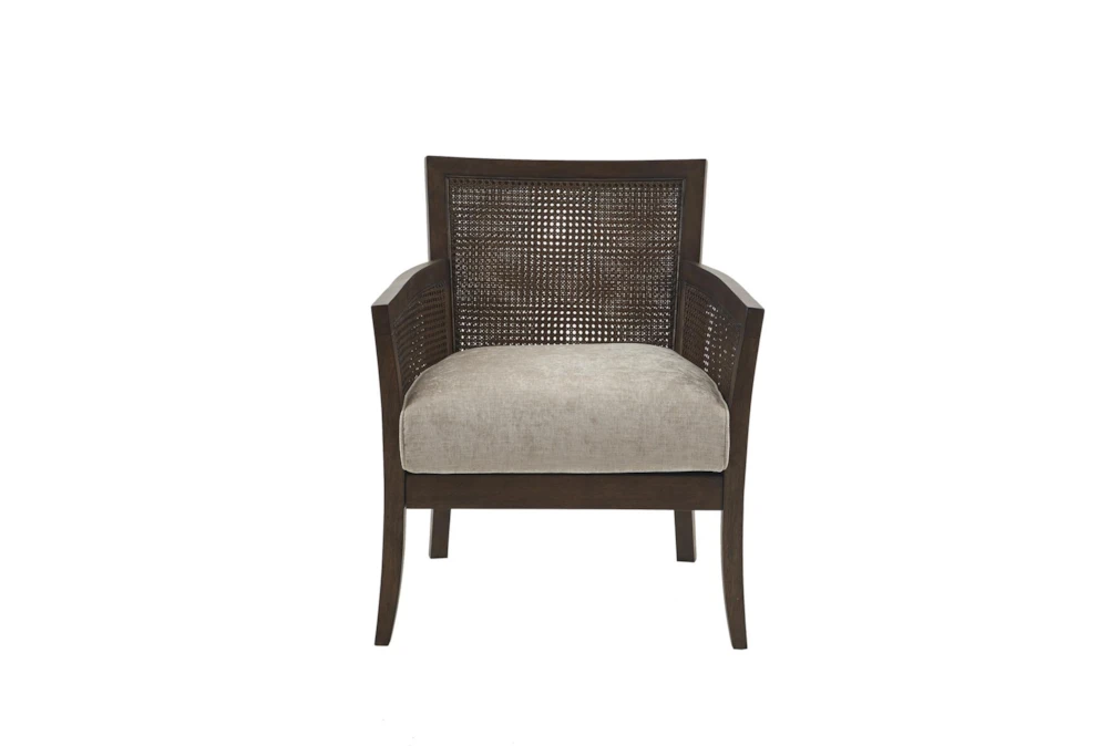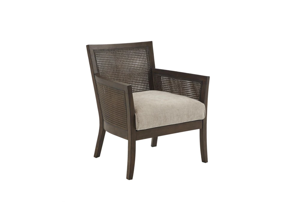 The Caitlin Brown Accent Chair is a rustic-style piece with arms, made of solid wood and cane. Assembly is required, and the tan/espresso color coordinates with the medium coffee finish of the wood.