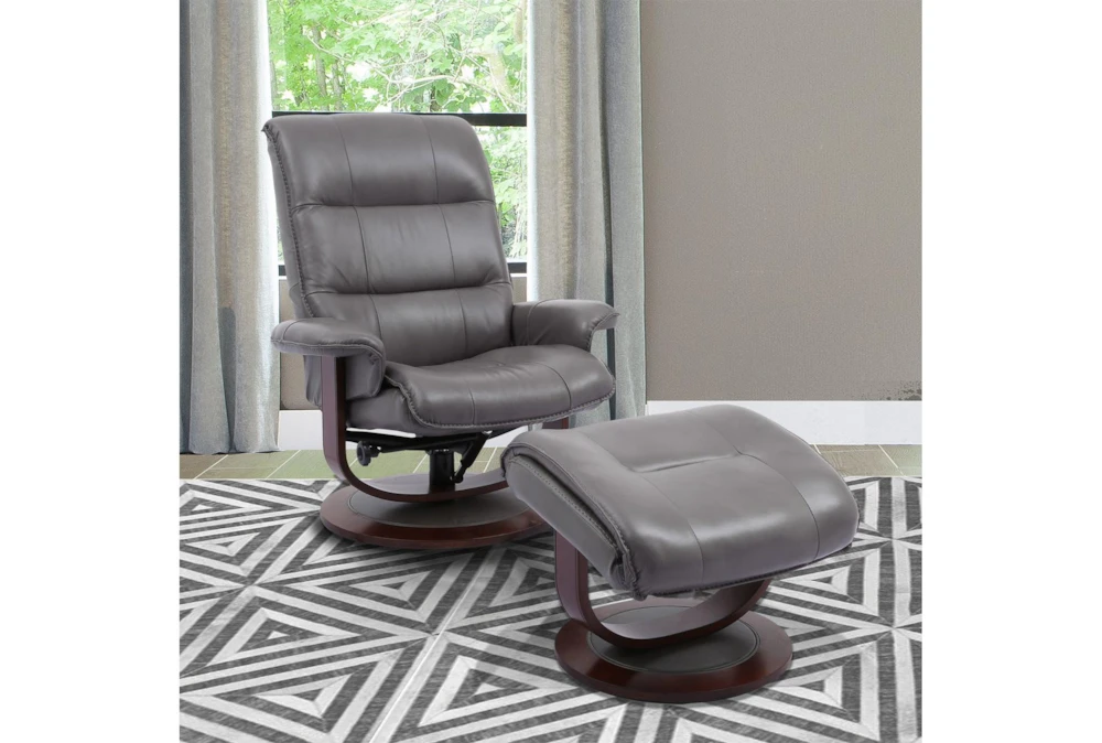 Add a touch of casual elegance to your living room with the Dalbert Grey Leather Manual Reclining Swivel Chair and Ottoman, featuring foam cushions, a tight back, and channel tufting for added comfort and style. With the added convenience of adjustable swivel and high back support, this indoor set with arms and back is the perfect addition to any home.