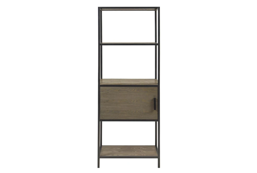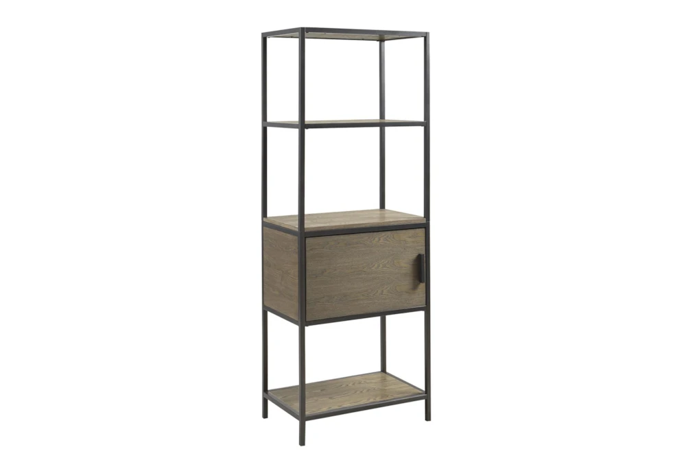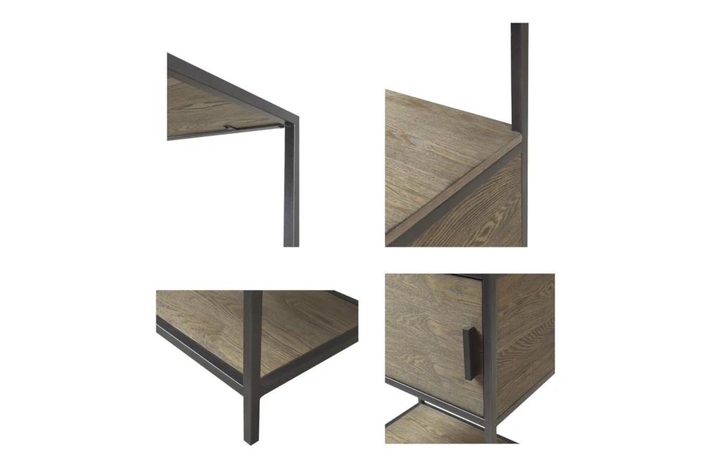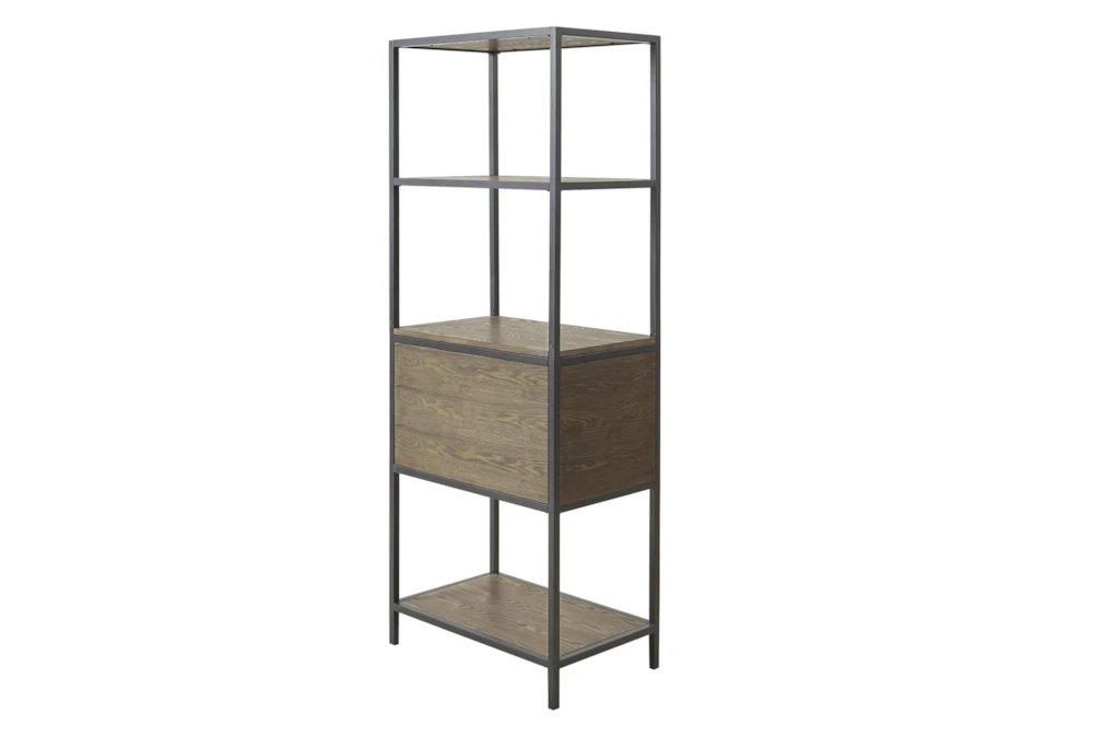 This Darlen 48″ grey bookcase is a contemporary piece made of wood with a storage cabinet. It requires assembly and features a metal frame and legs with a reclaimed gray smooth wood finish and iron metal finish.