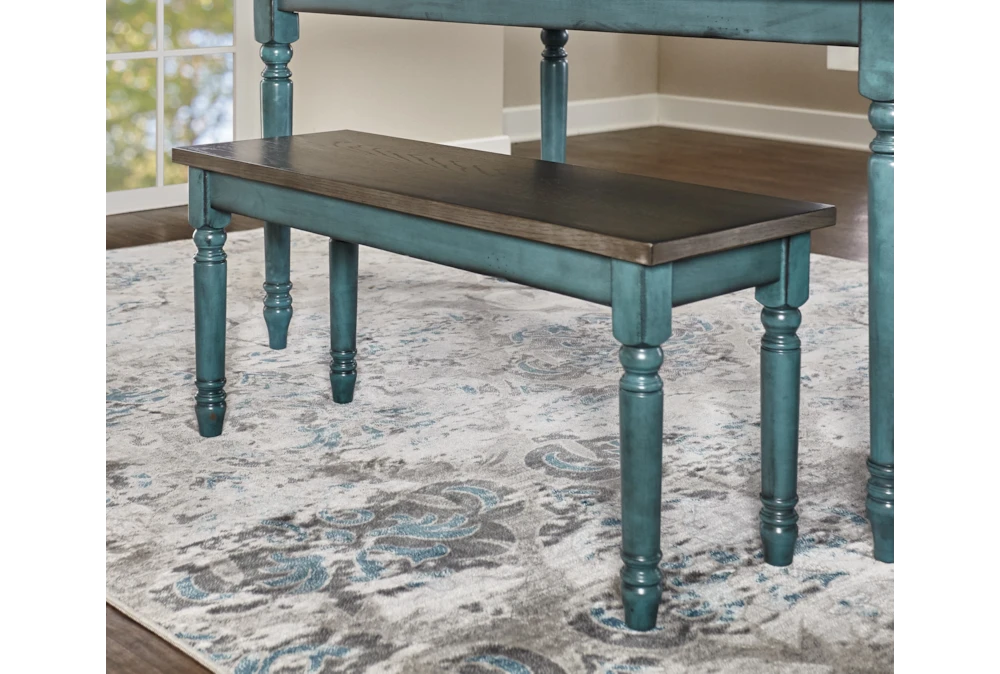 The Davis Teal Dining Bench is a narrow, traditional-style wooden bench with metal accents, ideal for use in a dining room. This bench requires assembly, features a beautiful teal blue color, and is made from MDF, rubberwood, and hardware.