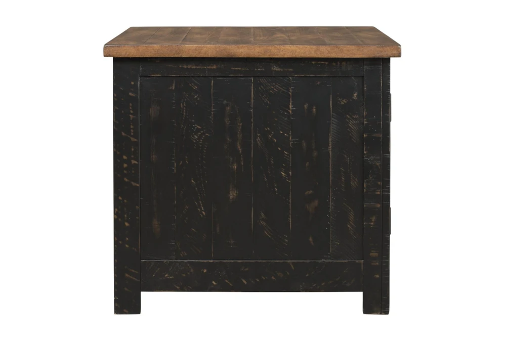The Delburne Storage End Table is a stylish and functional addition to your living room, featuring shelves and doors for ample storage. This rustic table is made of black-colored wood and pine veneers, as well as engineered wood, and requires assembly.