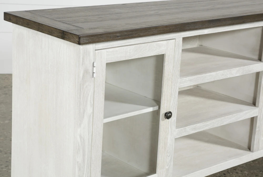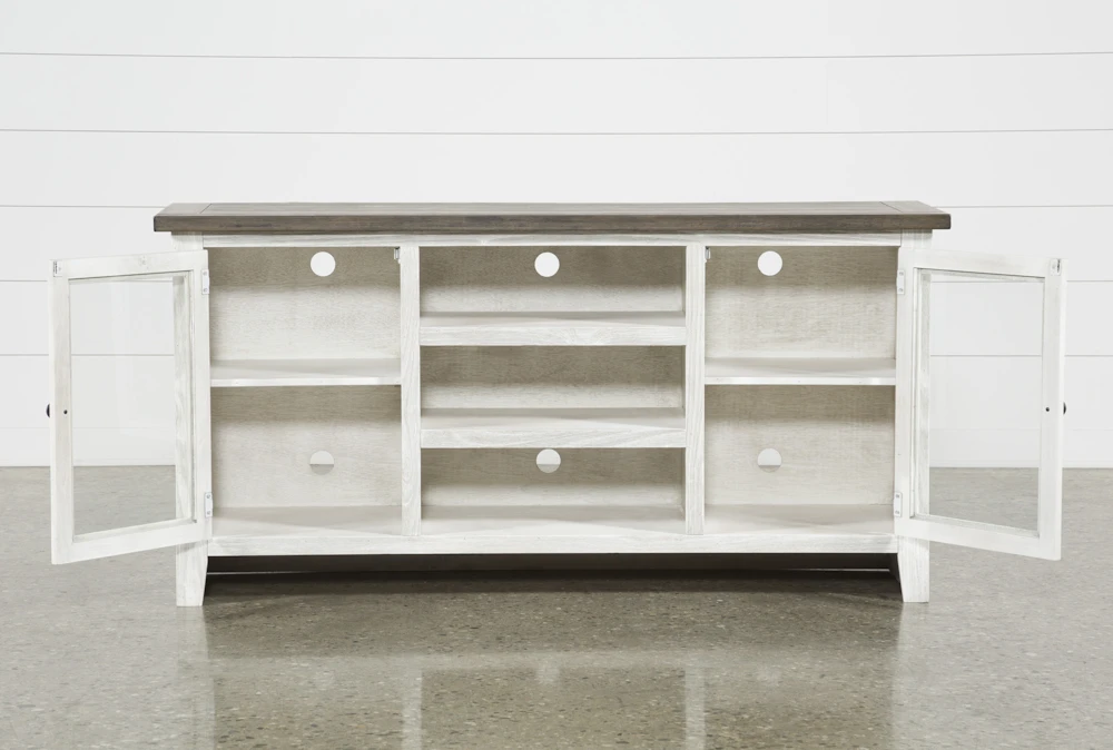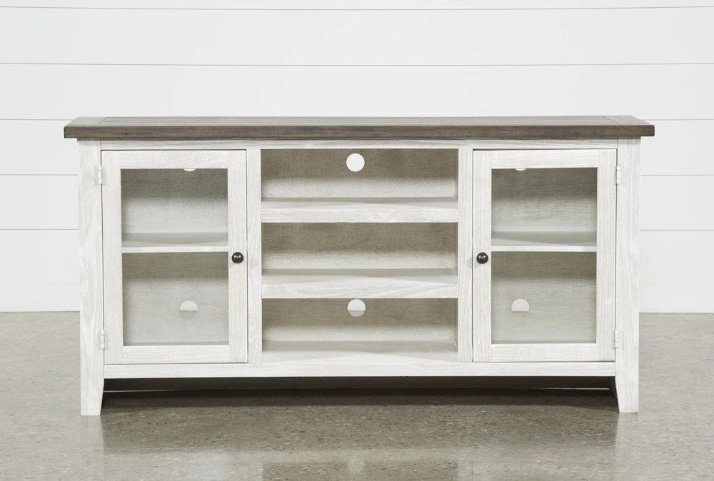 Thanks to a charming two-tone finish, our Dixon TV stand brings a touch of cottage character to your living room. Crafted with wood and veneers, the design allows you to enjoy a fresh twist on traditional farmhouse taste. Its distressed base features cord cutouts and shelving for media essentials, while the planked top adds rich texture and surface space for TV screens.