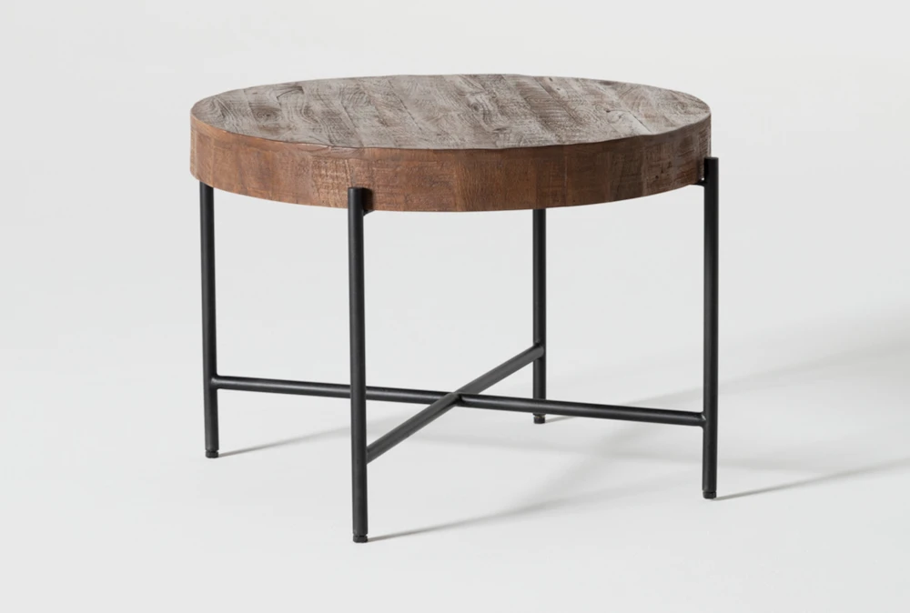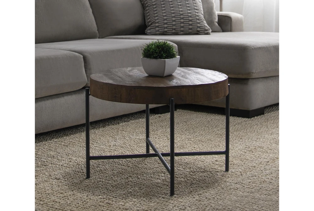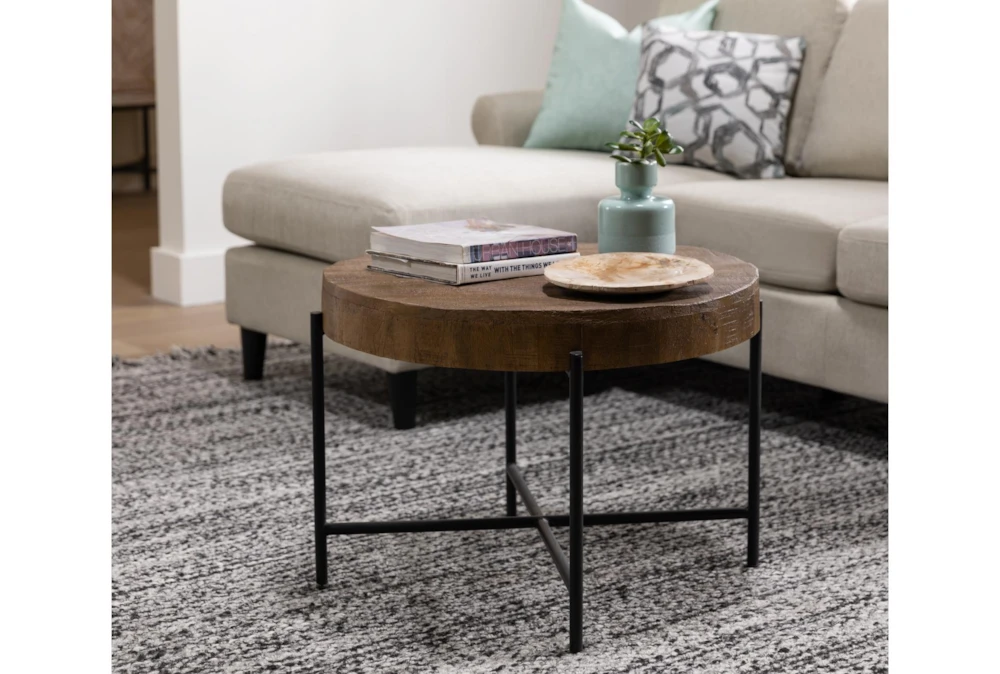 Bring rustic modern style to your living room with our Dunkin round coffee table. The perfect platform for displaying dรฉcor and more, it features a mixed material design that combines the natural beauty of mango wood with the sleek appeal of metal. Thanks to its round shape, it pairs seamlessly with sectionals and sofas.