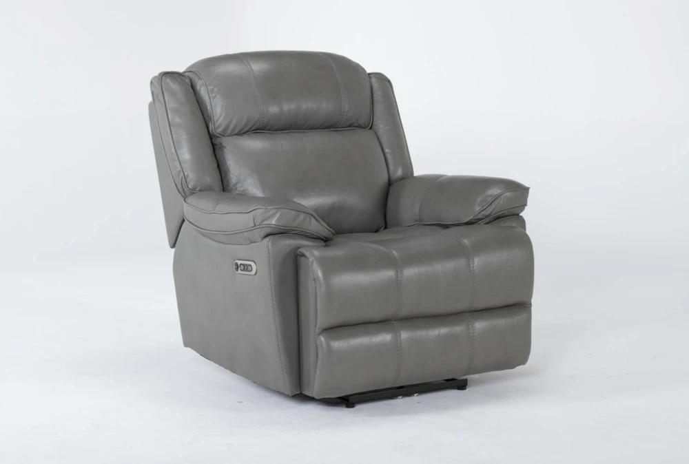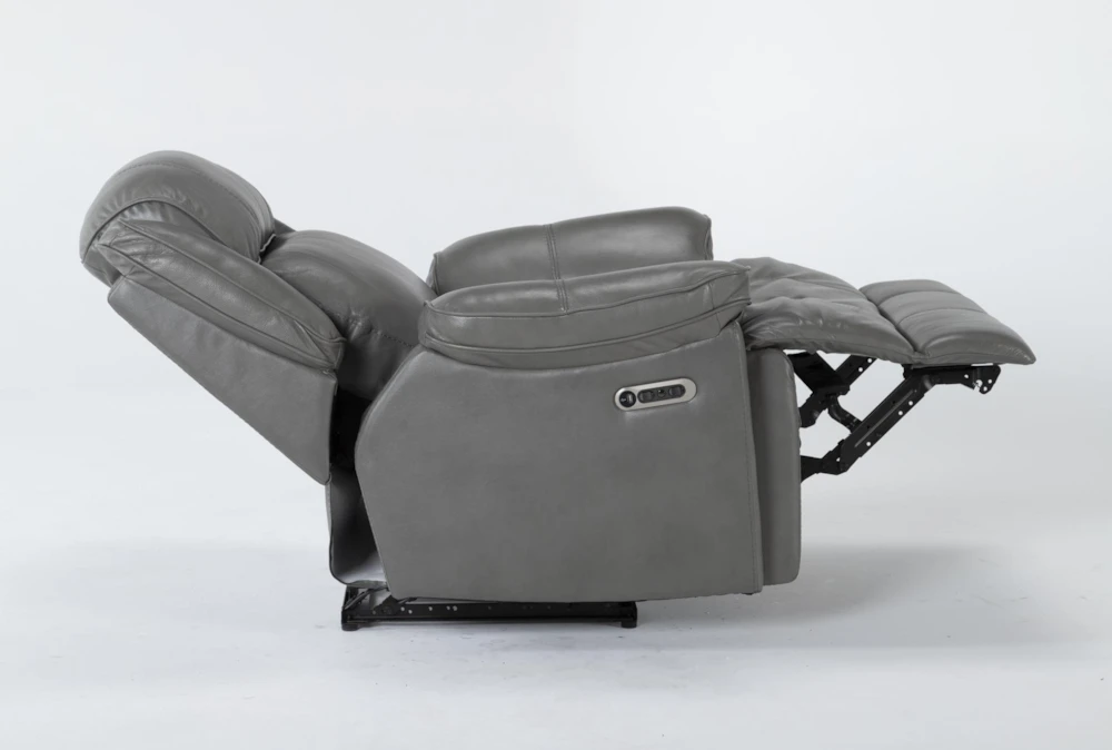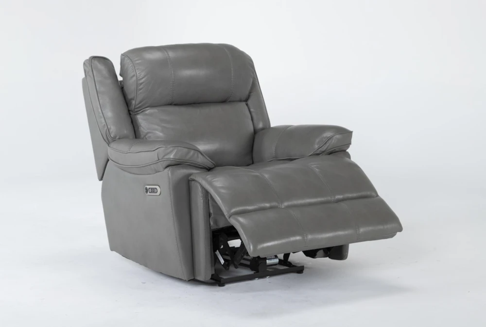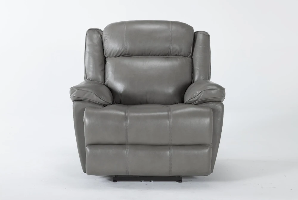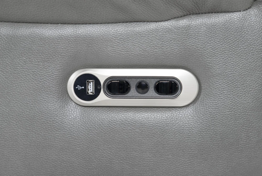 If you enjoy lounging more than anything, you’ll love our deluxe Eckhart power recliner. It comes in two neutral hues – brown and grey – so you can choose the perfect fit for your space. There are an array of desirable features, including power motion and a power headrest that adjust to a variety of positions for premium relaxation. Offering the ultimate in sophistication and quality is top grain leather seating with a vinyl match that’s extra durable and cleanable. Padded arms and a bucketed seat provide additional comfort, while a USB port brings tech-savvy convenience.