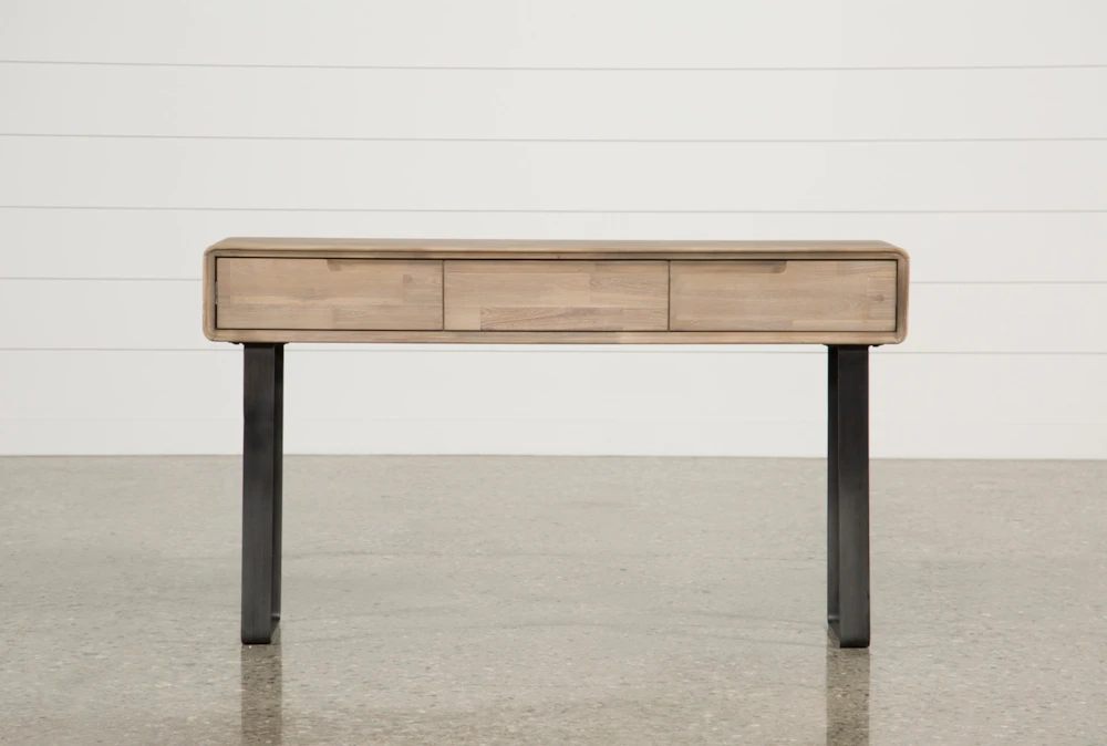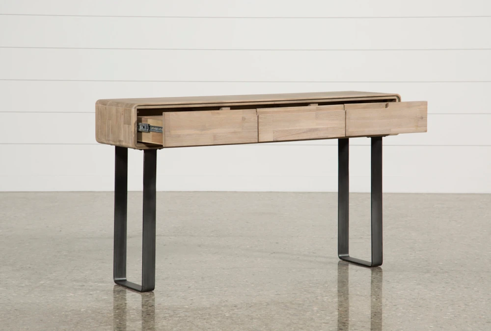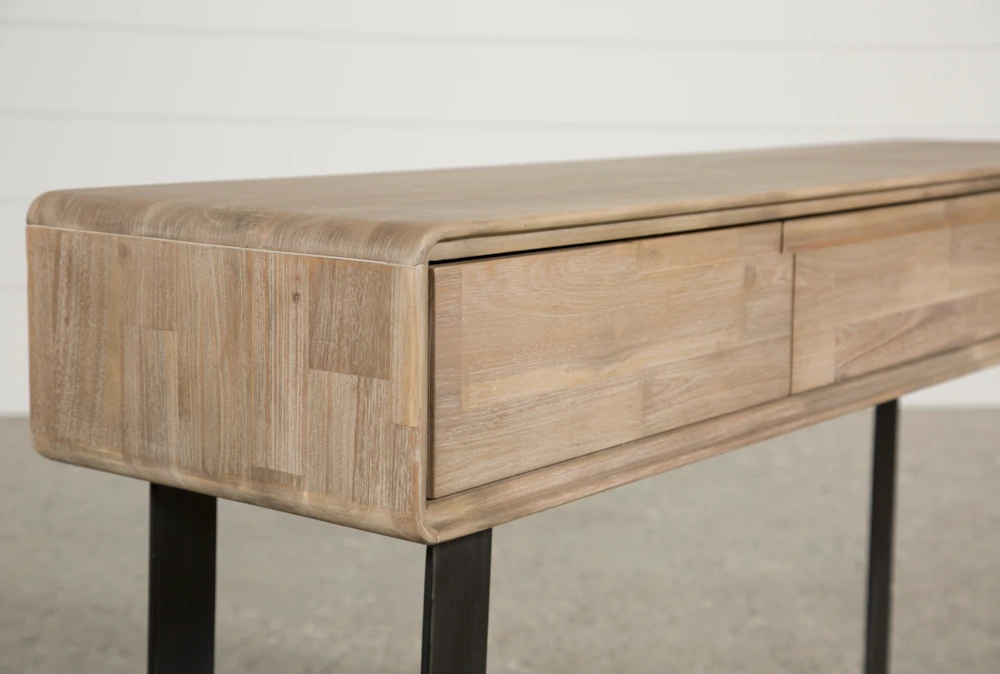 Give your living room a fresh, edgy vibe with our ultra-sleek Forma console table. A master of minimalism, it makes clean lines look cooler than ever. Airy metal legs provide a striking, sturdy foundation for solid acacia, which is decked in an on-trend grey finish. The design also features drawers for seamless storage.