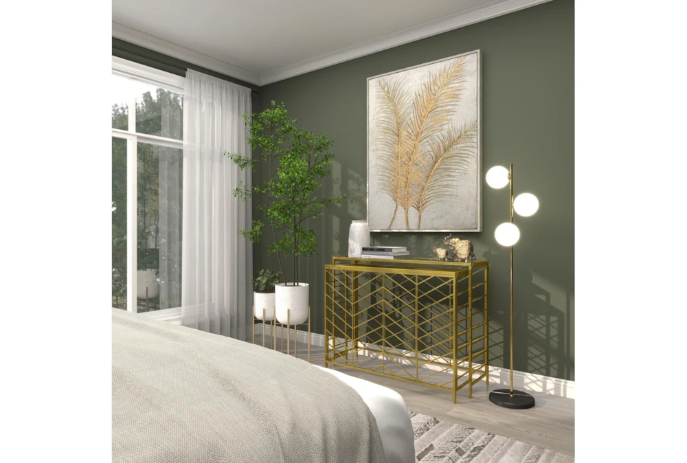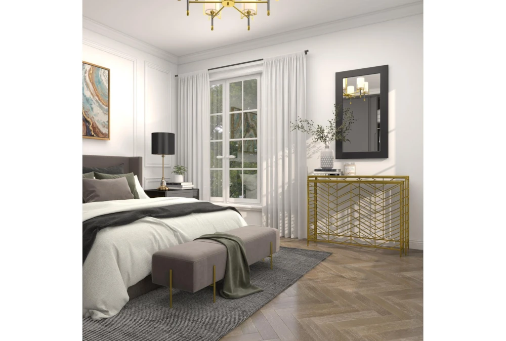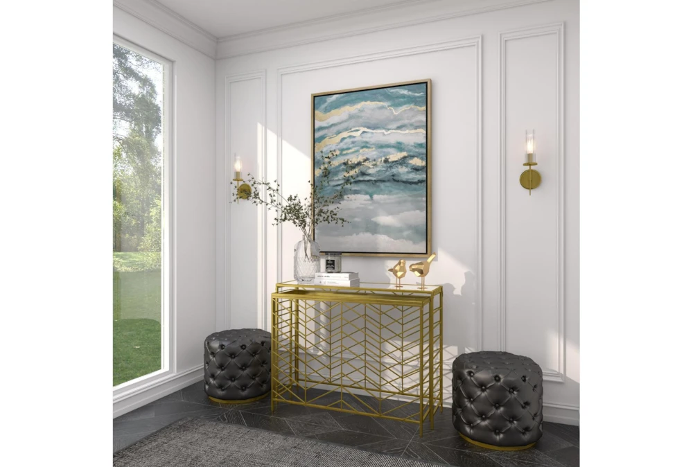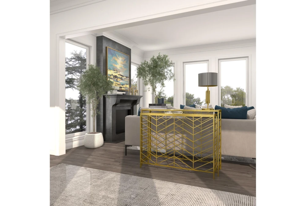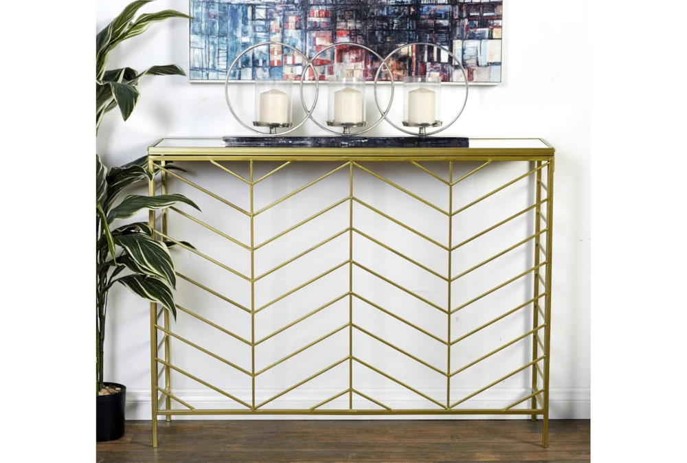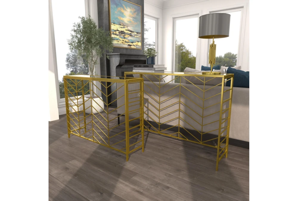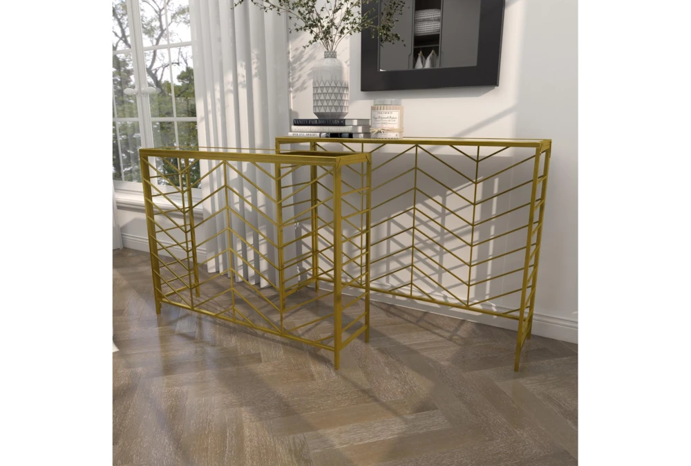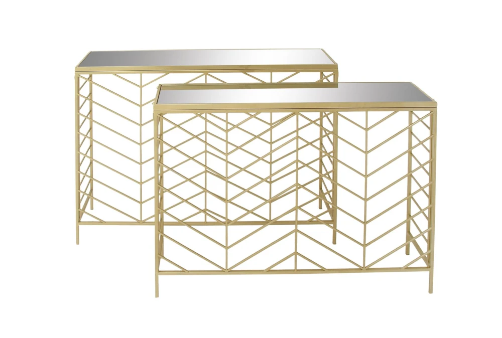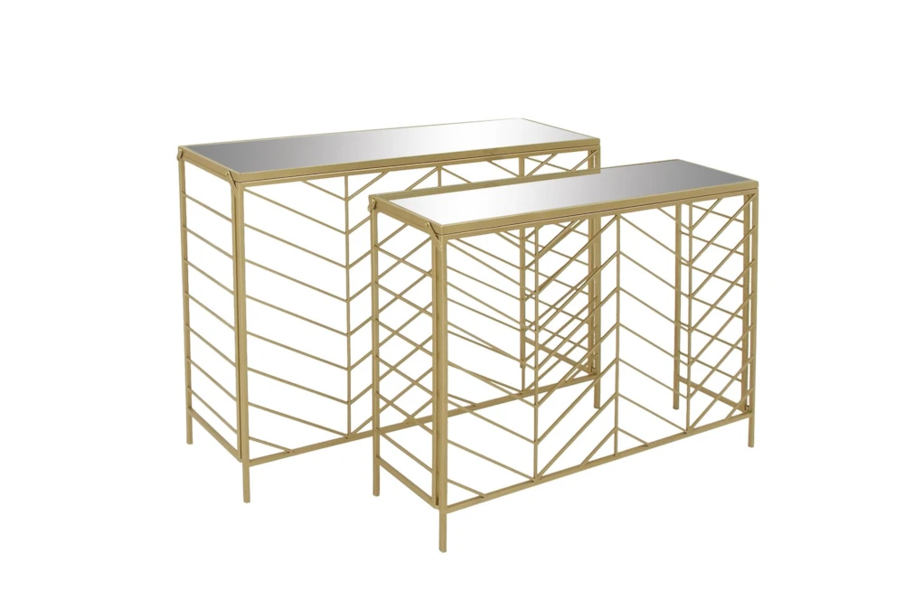 Gold Iron Console Table Set Of 2 – A contemporary style offers neutral elements and basic forms with a bold design, these Gold nesting console tables are made of iron frame with reflective mirror top, featuring a combination of chevron and horizontal bars structure with an open back side for optimal storage. The metal console table set has a gold-finished frame and a spacious mirrored top, making them perfect for any living room.