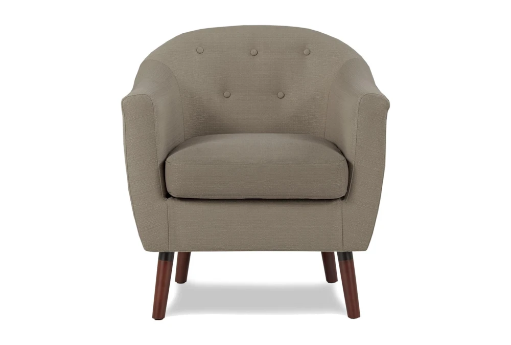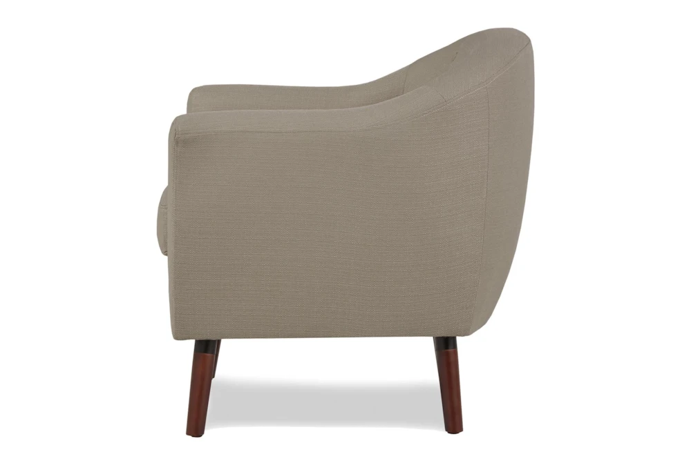 The Heaton Beige Accent Chair is a mid-century modern style indoor club chair made of fabric and wood, featuring tufted button detailing on the tight back and foam cushions, with curved track arms and assembly required.