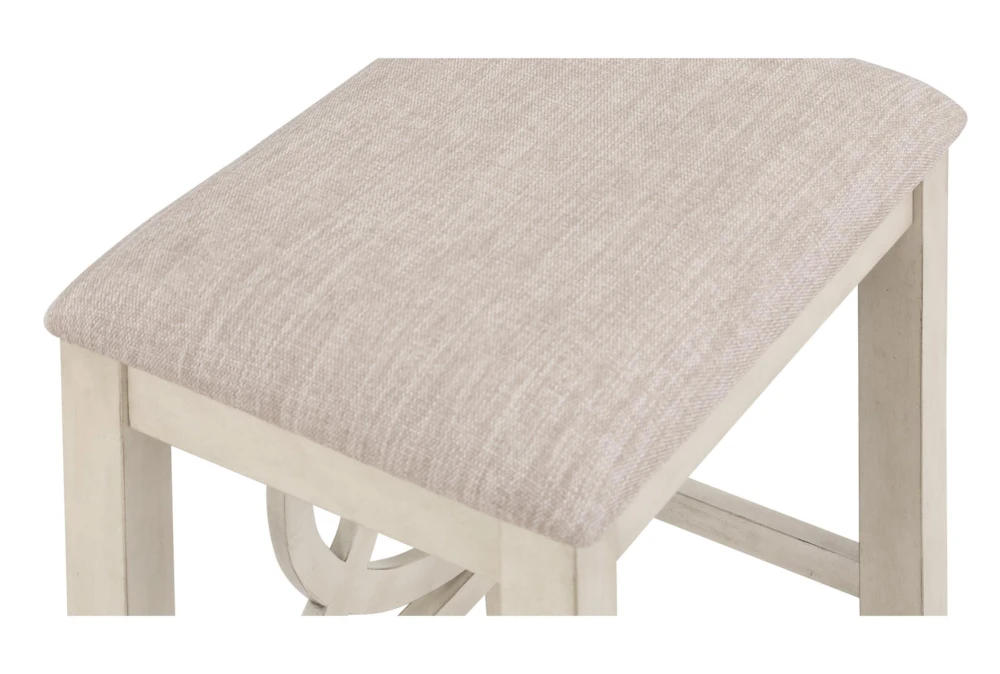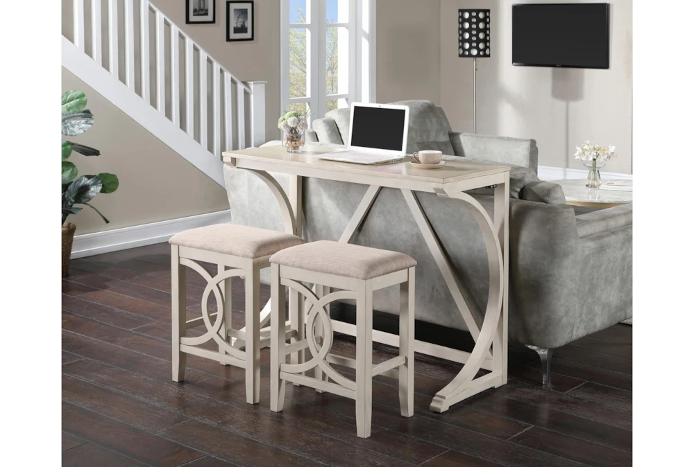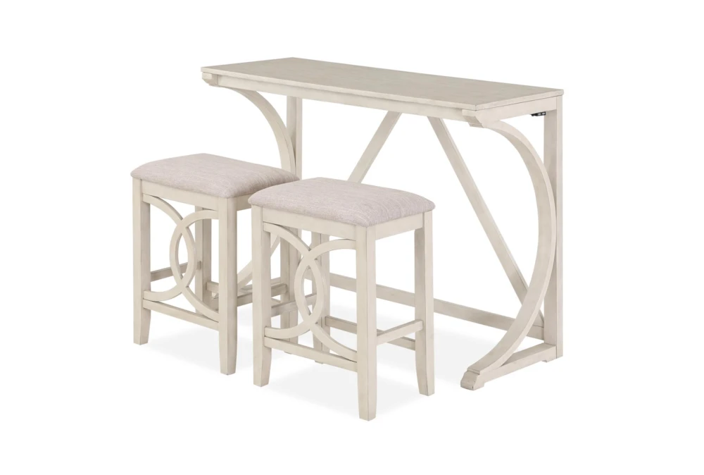 Elevate your living room with the Keyes Beige 3 Piece Console Bar Set, boasting a traditional style and crafted with veneer and wood materials. This backless set comes complete with stools, perfect for entertaining guests or enjoying a casual drink.