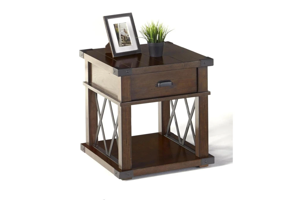 The Landmark Rectangular End Table boasts an industrial style with its veneer material and rich brown color, making it a perfect addition to any living room. This piece is ideal for small spaces and requires assembly, but is conveniently shipped via UPS parcel.
