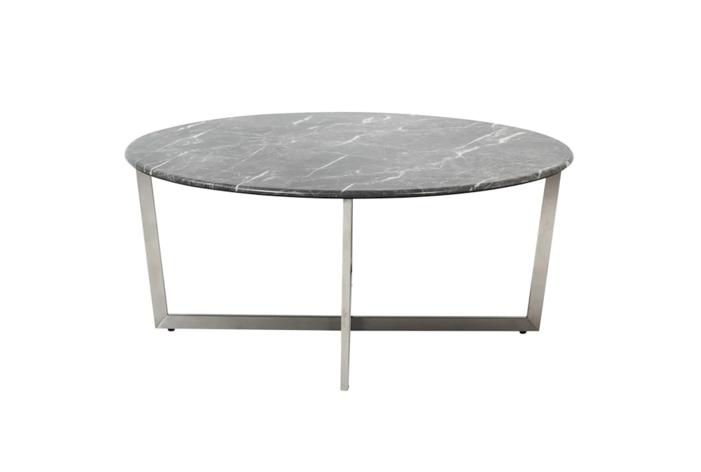 The Liv Black Faux Marble Round Coffee Table boasts a sleek modern style, with a luxurious marble top and brushed stainless steel base. Assembly is required for this stunning piece, which adds a touch of sophistication to any living room with its black and faux marble finish.