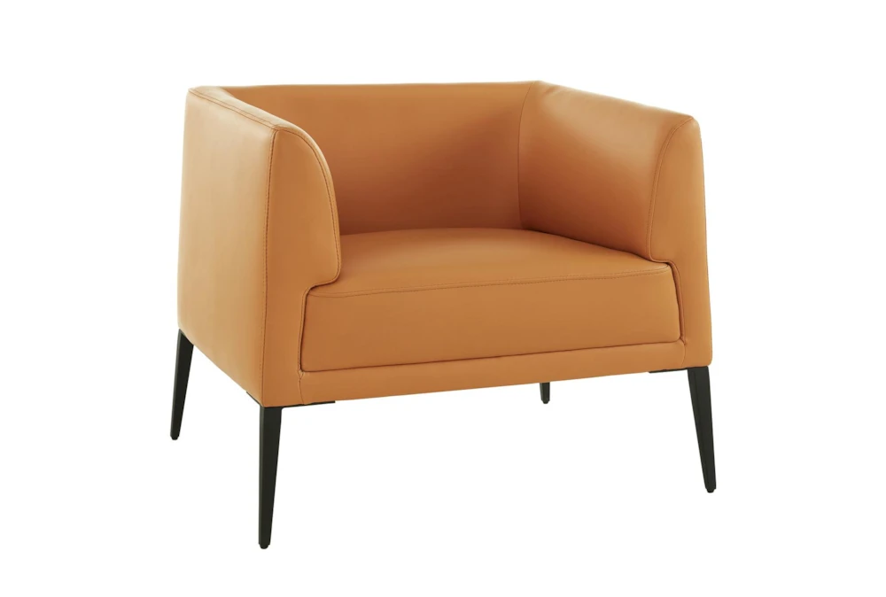 This modern lounge chair is upholstered in cognac leatherette over foam seat, back, and armrests, with a solid wood frame and matte black powder coated solid steel legs. Assembly is required and the chair features adjustable feet for added stability.