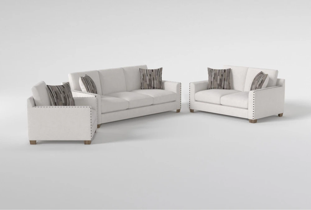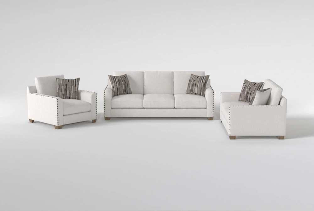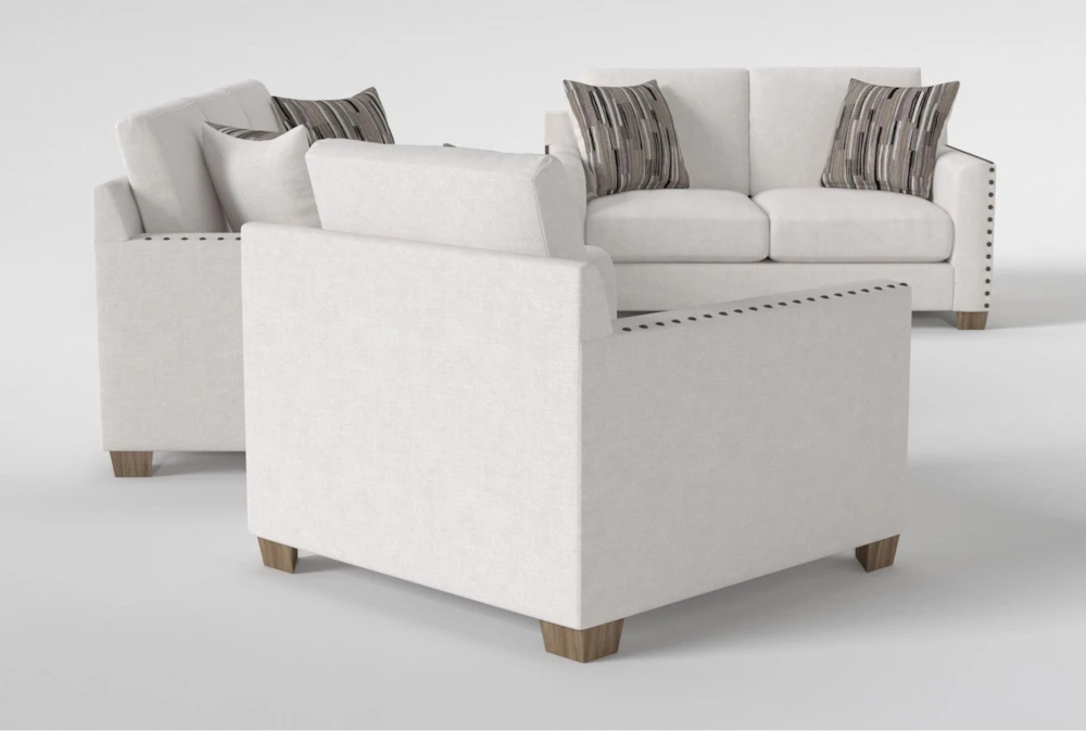 Beauty is in the details, and our Modena collection shines bright from every angle. Clean lines and crisp, tailored frames boast modern appeal, while bold nailhead trim makes a sophisticated and distinctive statement. In addition to removable screw-in weathered oak feet that bring a fresh, natural look, warm neutral tones and contemporary accent pillows top things off in style. Stocked in a woven performance fabric that’s stain-resistant, each piece offers exceptional durability and practicality. To help maintain comfort, support and quality, the plush Dacron-wrapped foam cushions are loose and reversible. Through our custom upholstery program, you can choose from a variety of fabric options at no extra cost.