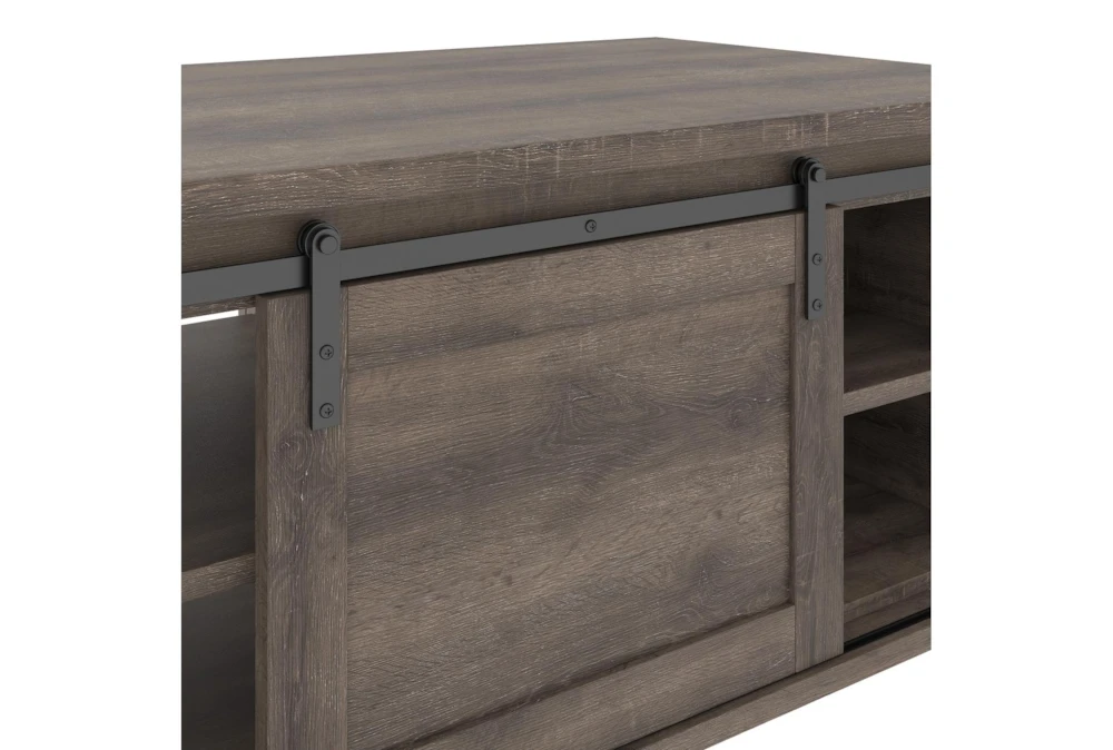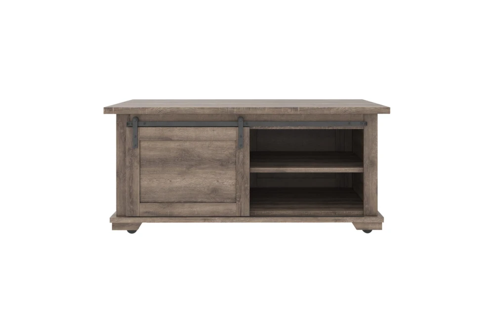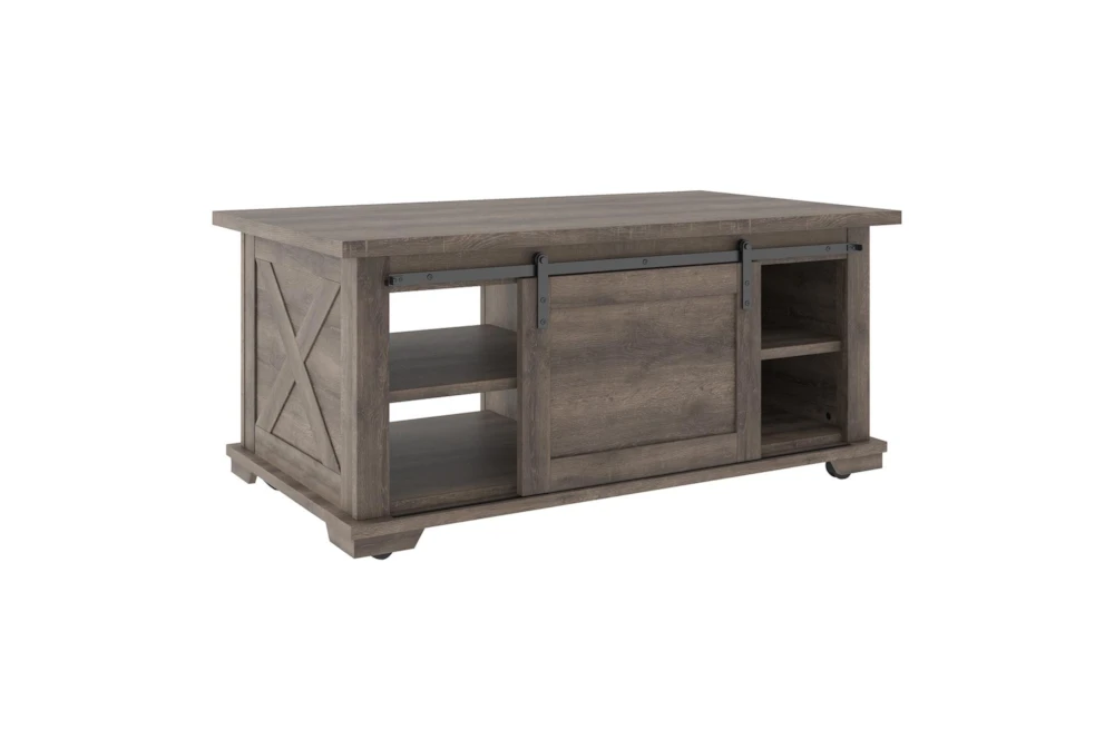 The Montana Storage Coffee Table With Wheels is a rustic-style table made of wood and comes in a grey color, featuring a sliding barn door and casters for easy mobility. It also offers storage and shelves, with decorative laminate over engineered wood, and requires assembly.