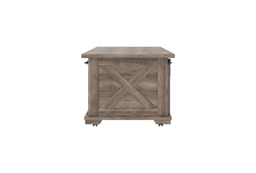 Modern farmhouse design. Tables are made with a paper laminate featuring a replicated weathered oak and engineered wood substrate. Storage cocktail table features a sliding “barn door” and cross-buck end panels. Includes casters for mobility. Lift top cocktail table has drawer for storage. Choice of drawer end table or an open shelf end table with cross-buck design. These items are designed to be flat pack RTA for express ship opportunity.