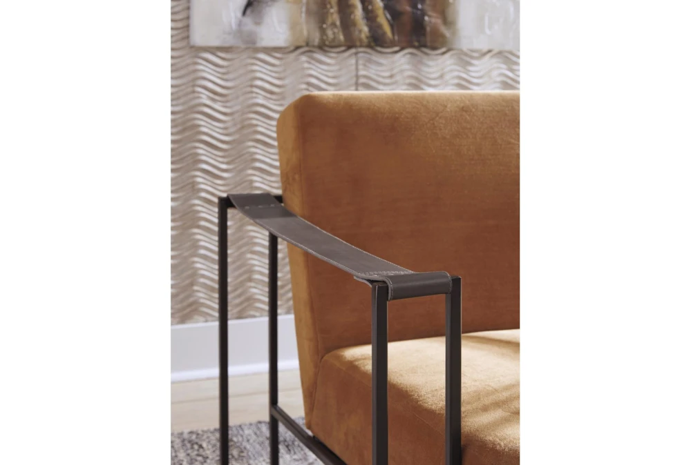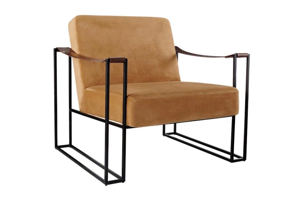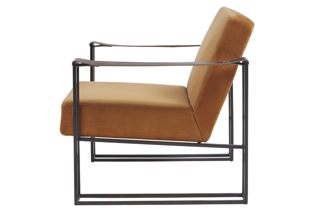 Accent Chair. Metal Arm With Leather Strap. Upholstered in Amber Polyester Velvet and Brown Leather. Attached Back and Seat. Metal Base in Oil Rubbed Bronze Finish.