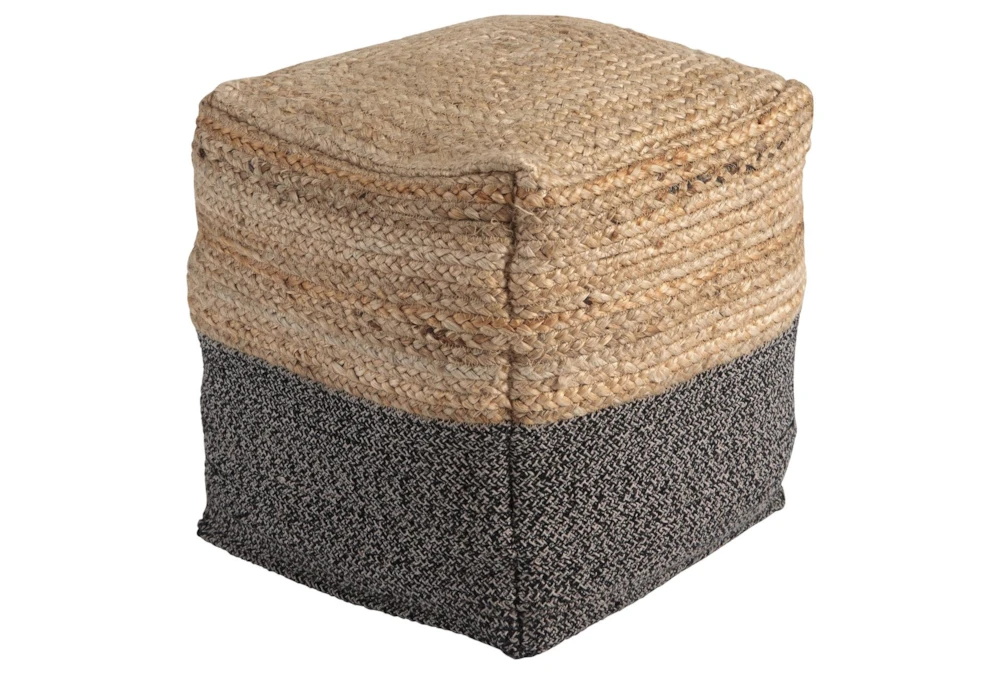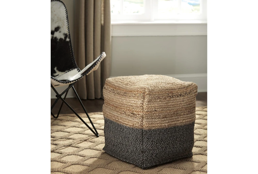 Pouf. Braided Design in Natural and Black. Jute/Cotton Blend Cover with Polyesterene Bead Filling. Zipper Closure. Spot Clean Only