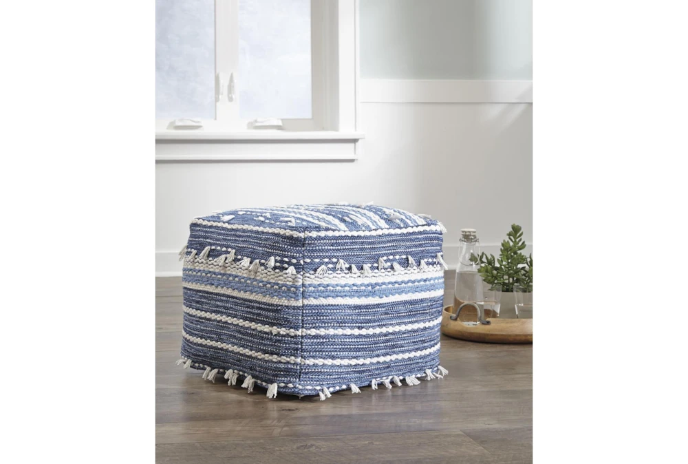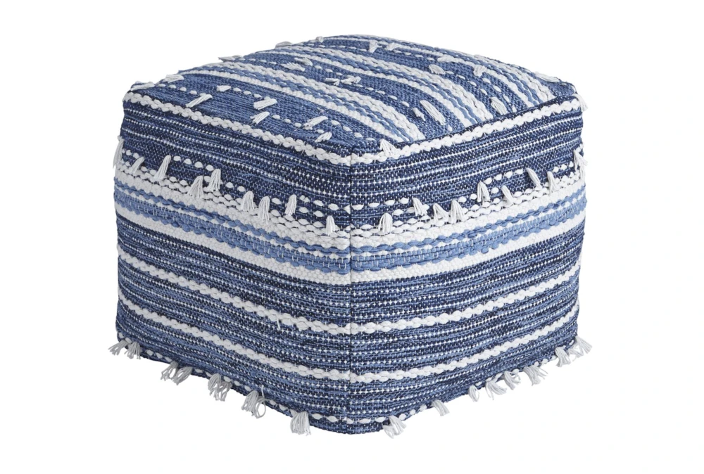 Elevate your home decor with our Pouf-Tassel in Blue/White, proudly made in the USA using high-quality cotton material. This rustic-style pouf features a unique fringe detail that adds a touch of elegance and charm to any room.