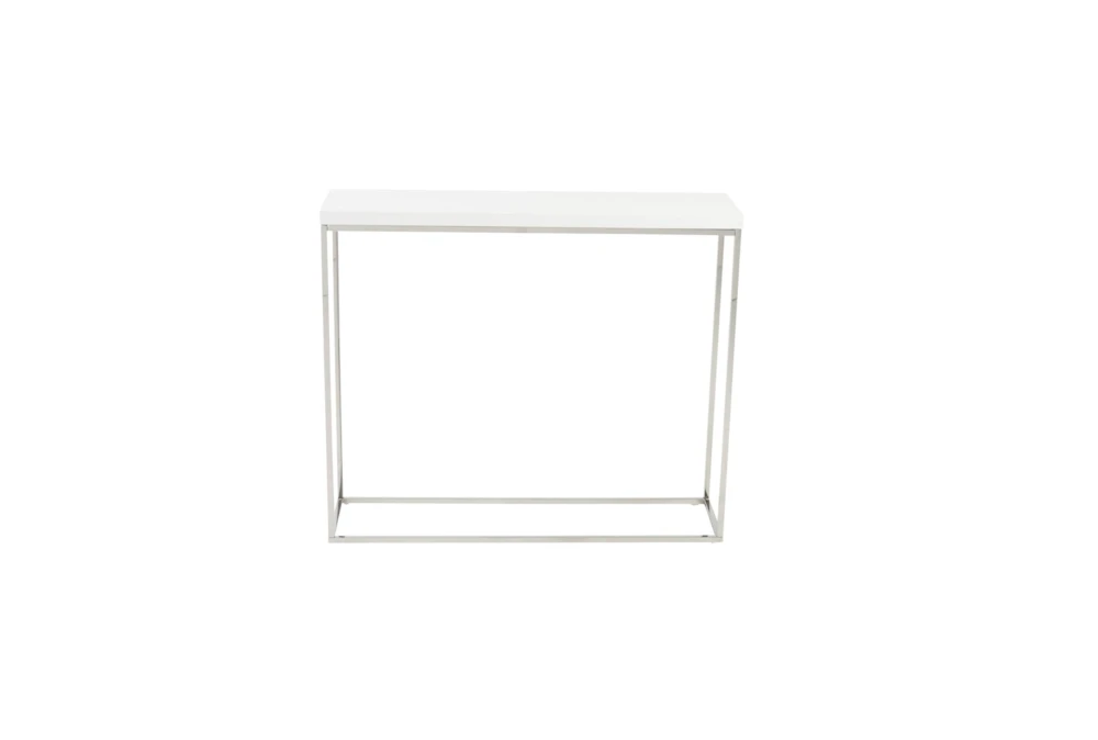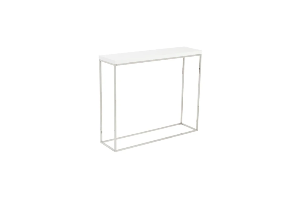 The Riley White 35 Inch Console Table boasts a polished stainless steel base and a narrow, modern design, perfect for small living spaces. Crafted from high gloss lacquered MDF in a white finish, this table requires assembly and adds a sleek touch to any living room.