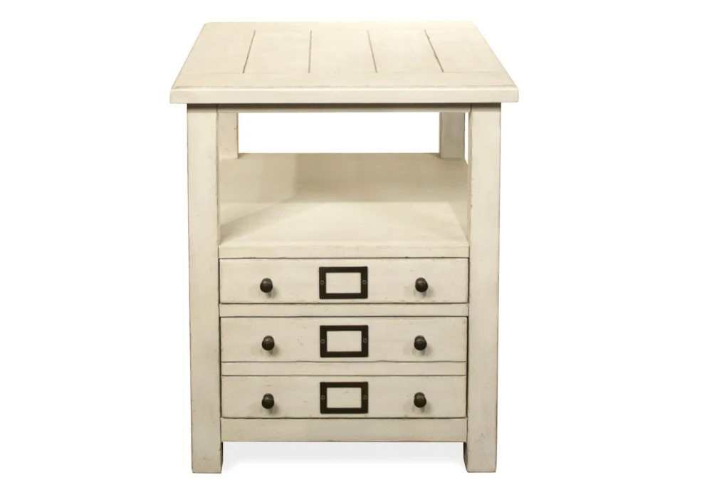 The Salinger End Table is a traditional style piece made of poplar and birch wood, featuring both drawers and shelves for ample storage. It comes in a country white color and requires assembly.
