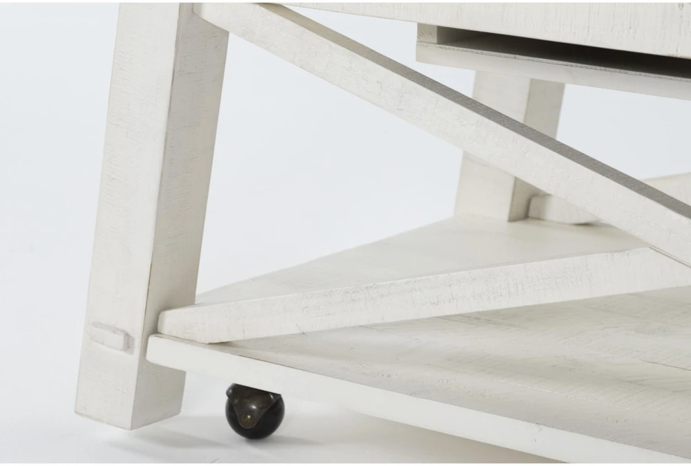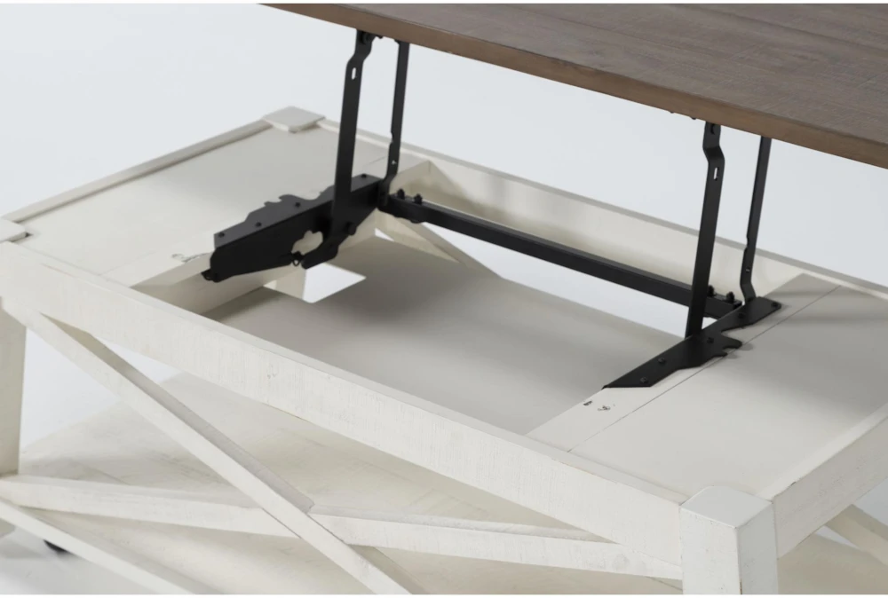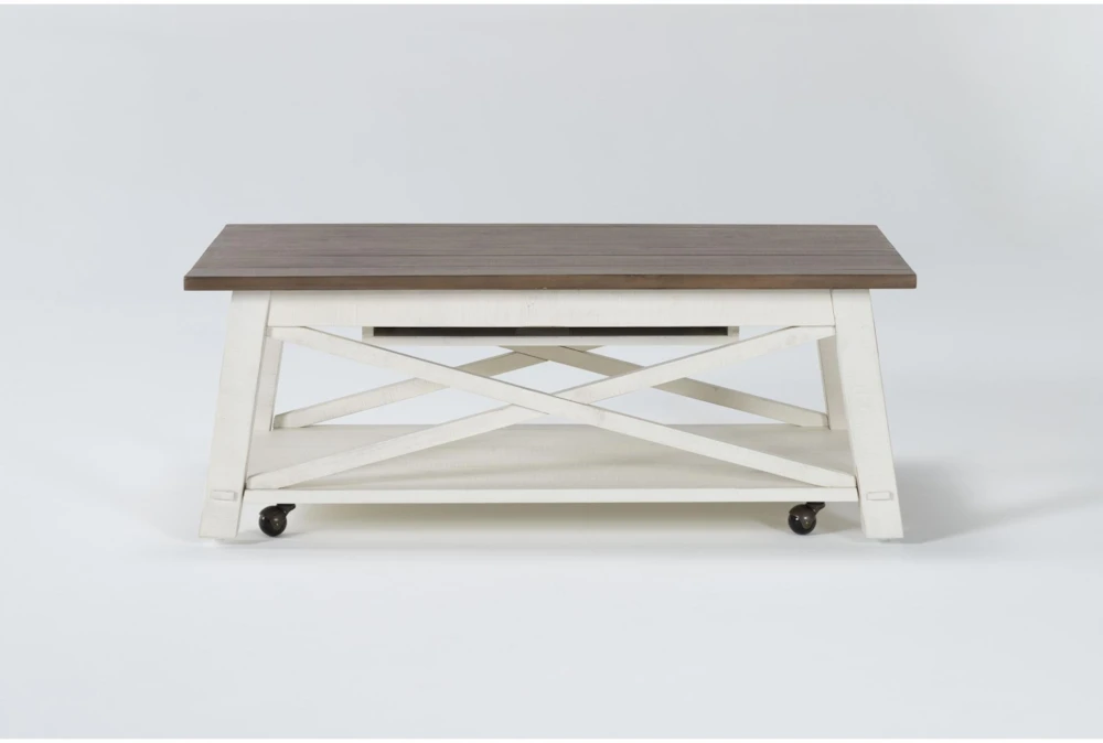 Full of character and function, our Sims occasional collection brings practicality and personality to your living room. Comprised of four coordinating tables, the set boasts decorative rustic details and a charming two-tone finish. In addition to a multipurpose lift-top coffee table that elevates to the perfect working and eating height and includes casters for easy mobility, there are two end tables and a console table that can accommodate an up to 50โ TV. All the pieces are distinguished by cross brace features and bottom shelves that showcase books and magazines.