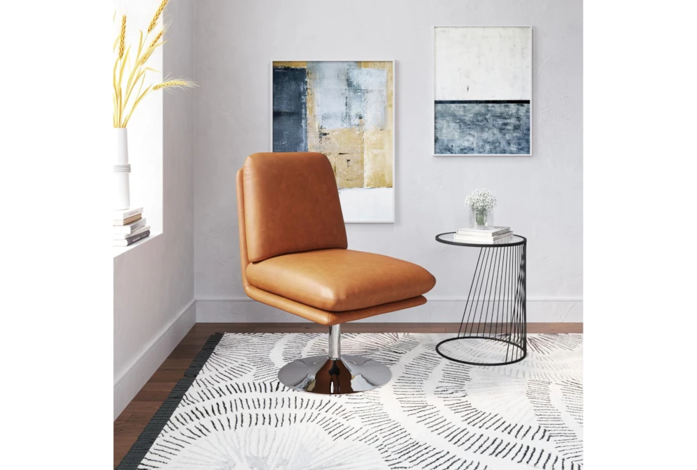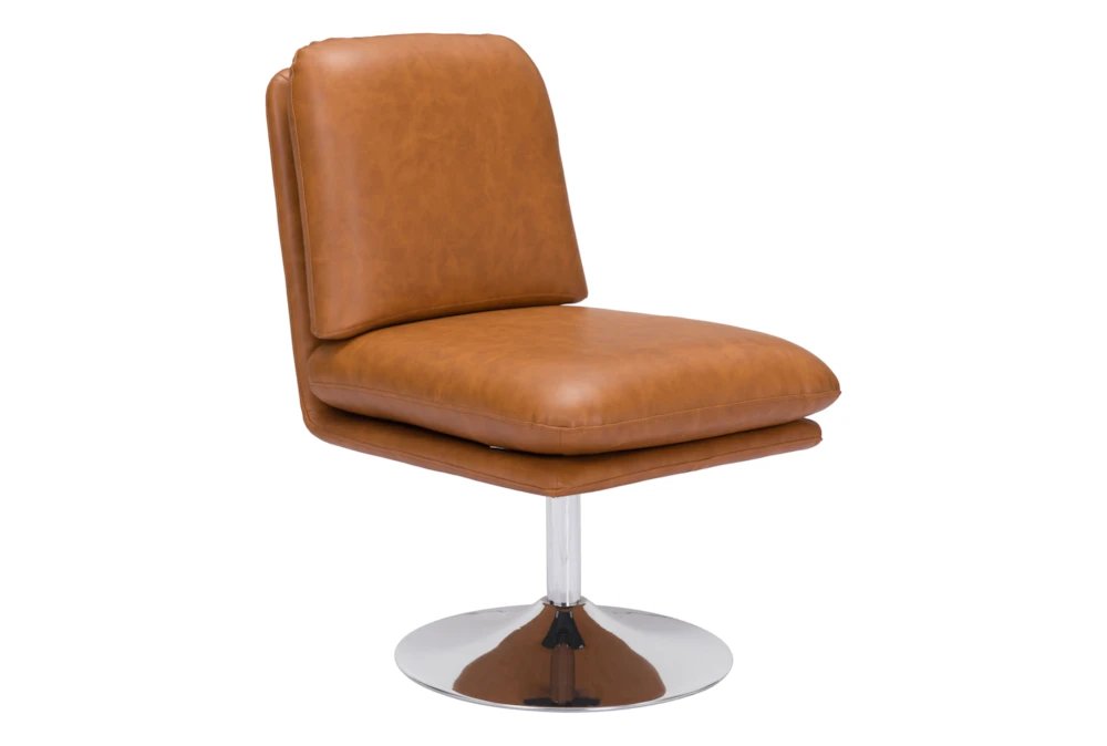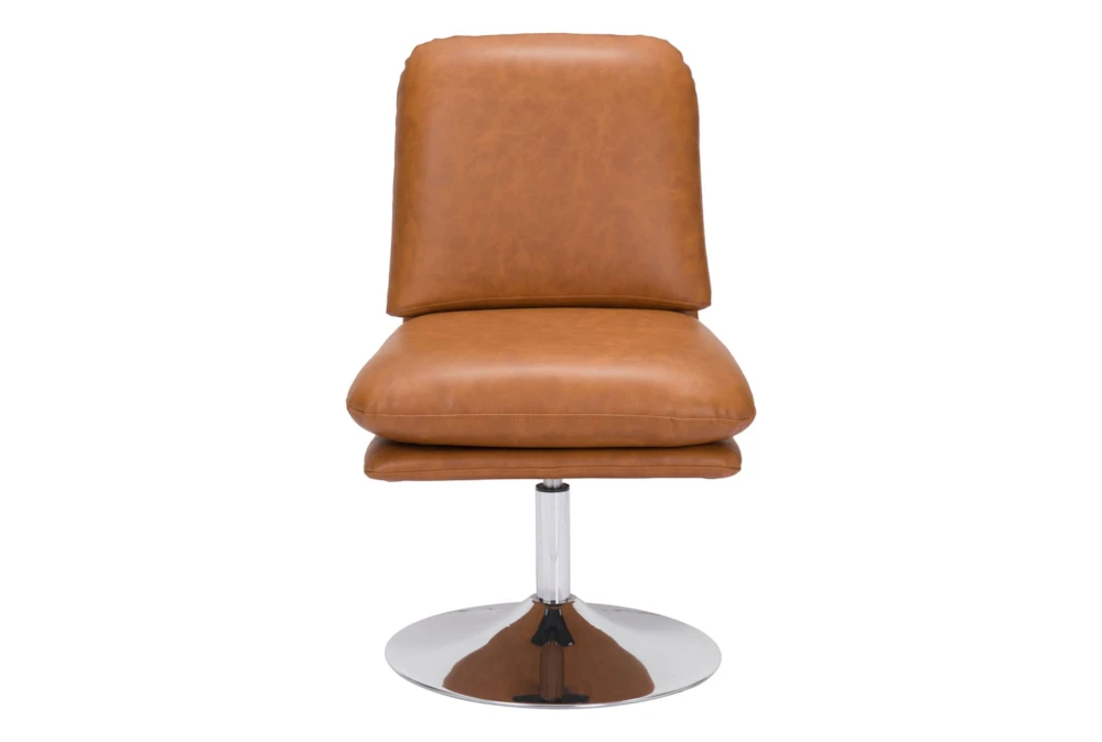 The Tanner Brown Faux Leather Swivel Chair is a modern style chair made of weather-resistant polyurethane material with foam cushions and a pedestal base. This armless chair is perfect for indoor use and features a swivel design with a backrest and cushion for added comfort and support. Assembly is required, and care instructions are included.