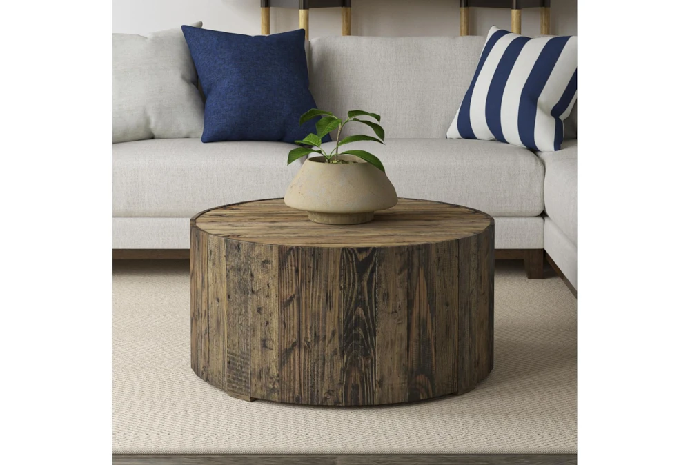 The Yuma Round Drum Coffee Table with Wheels is a rustic addition to any living room, made from solid hardwood and featuring a charming brown color. The table is crafted from rustic pine and reclaimed wood, and includes casters for easy mobility. Other features include sturdy solid hardwood construction.