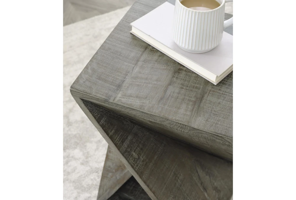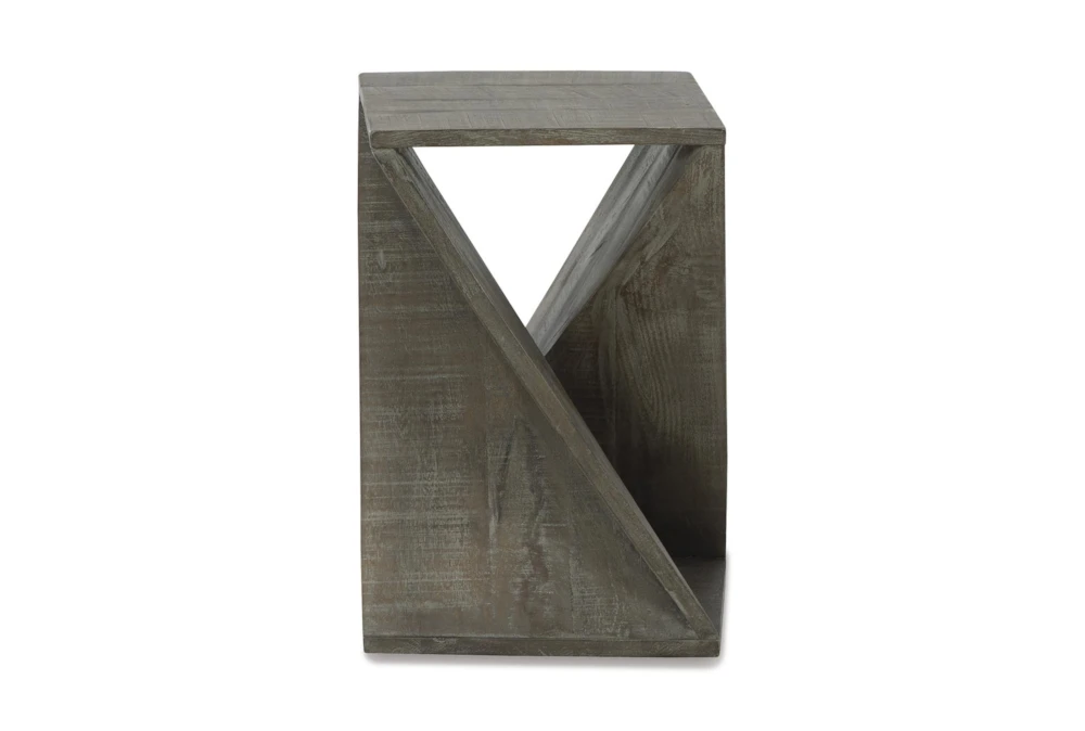 Made with wood in a distressed gray finish. Saw mark plank styling.